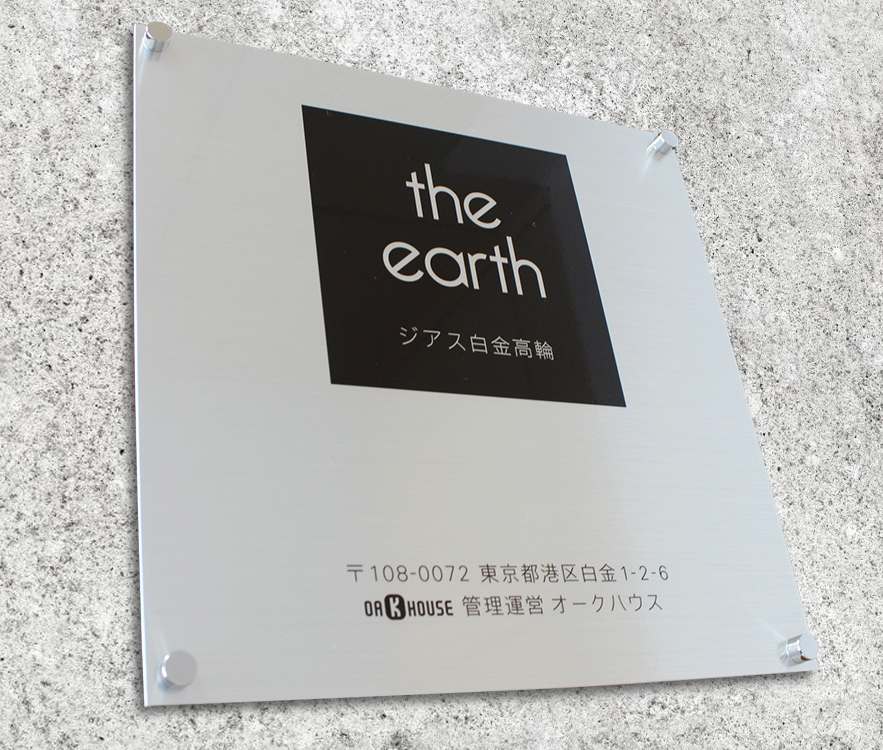 本物そっくり!高級感のあるステンレスのヘアライン調パネル看板です。本物のステンレス板に比べ低価格でご提供致します。